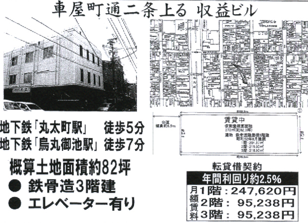 京都市中京区 地下鉄(丸太町駅)周辺 収益ビル一棟売り 京都市中京区真如堂町323-4地下鉄烏丸線『丸太町駅』徒歩5分価格:2憶1,000万円土地:公簿・283.34平方メートル 約85.71坪建物:鉄骨造3階建築年月:昭和52年8月商業地域:80/400%グーグル位置情報京都不動産情報 担当:モリタ迄お問い合わせ下さい。I.C倶楽部 不動産情報問い合わせフォームI.C倶楽部事務局 電話:075-583-3337 FAX:050-3488-2205 コメント コメントを書く コメントを書く コメント送信