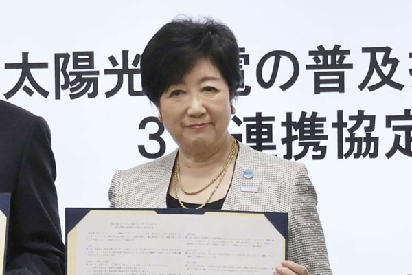 太陽光発電の普及を進める小池都知事(写真・共同通信)
