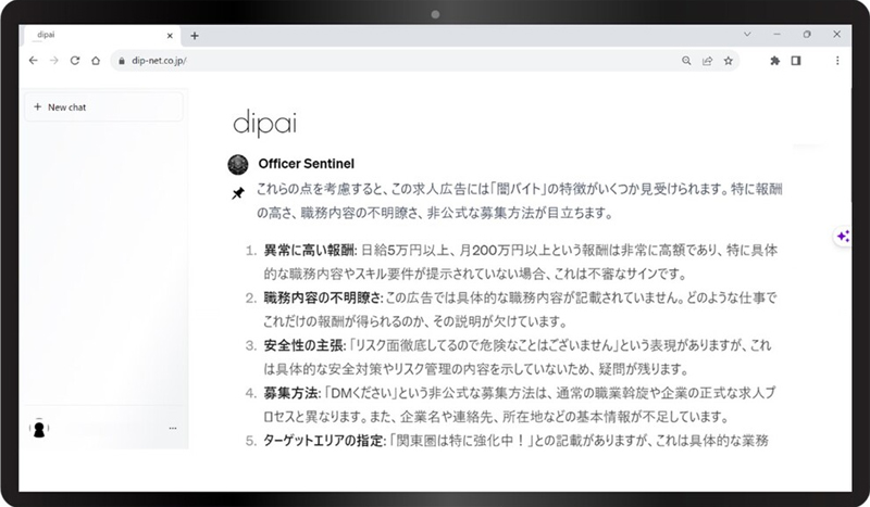 自然言語処理技術を活用た闇バイトチェックAIを開発し、活用を開始した。